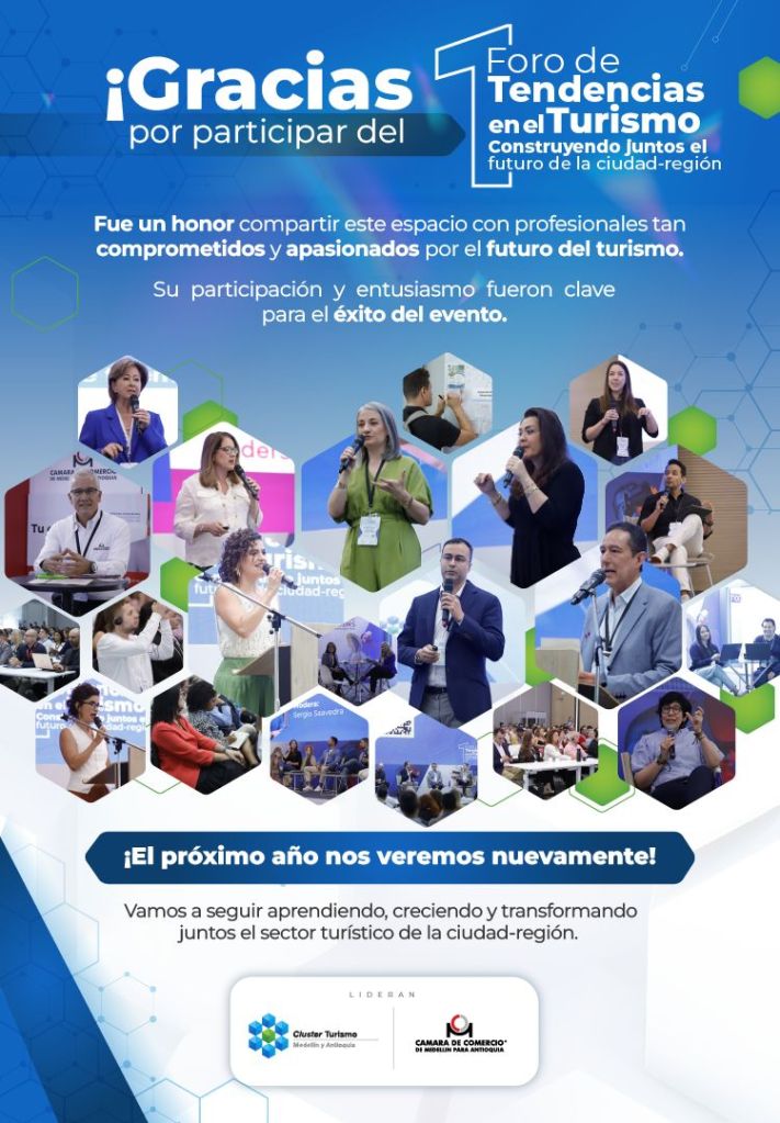 On November 5 and 6, the 1st Tourism Trends Forum was held in Medellín, Colombia, convened by the Chamber of Commerce and the Business Tourism Cluster, with the motto “Building the future of the city region together.” An event to learn about the most important trends in Tourism and generate valuable conversations on topics such as:
