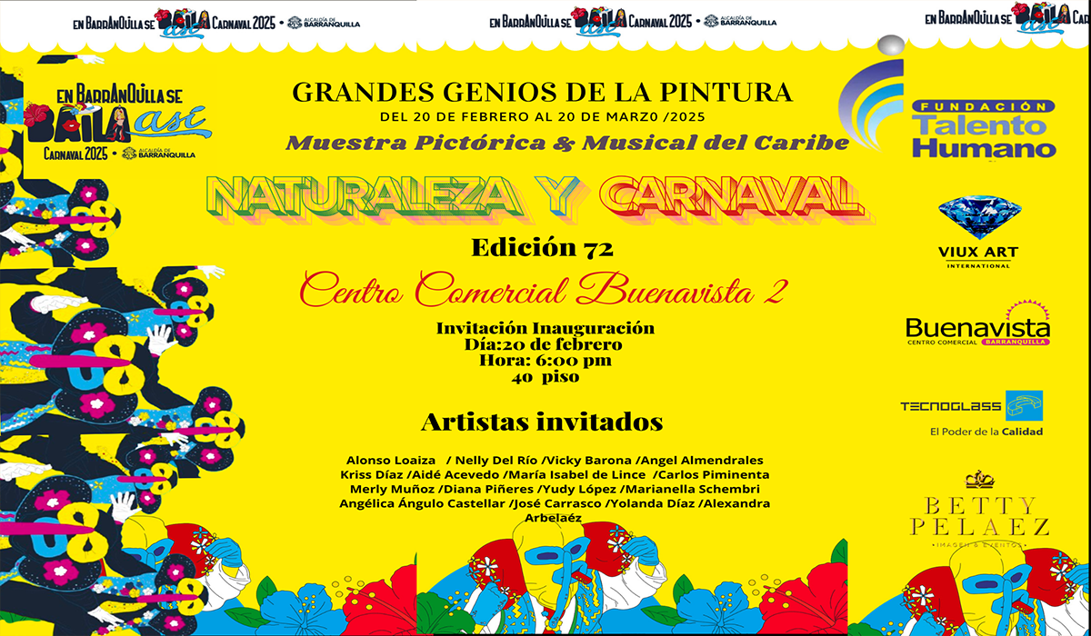 La Fundación Talento Humano, & International Art Gallery en alianza con Imagen & Eventos By Betty Peláez, inicia la gira nacional de los GRANDES GENIOS DE LA PINTURA colombiana. En la 72º versión de la MUESTRA PICTORICA & MUSICAL DEL CARIBE, la cual inicia del 20 de febrero al 20 de marzo en la ciudad de Barranquilla. Gracias al Portafolio de estímulos de la Alcaldía a través de la Secretaría de Cultura y Patrimonio; el enfoque será NATURALEZA Y CARNAVAL. La inauguración se realizará el día 20 de febrero de 6:00 a 9:00pm en el 4º piso del Centro Comercial Buenavista 2. La amenización musical estará a cargo de DANIELLE WALLACE MUSIC, degustando una copa de vino, con invitados especial y la prensa.