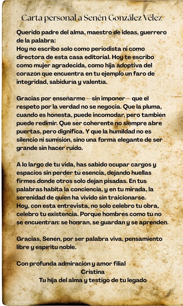 To speak with Senén González Vélez is to plunge into the abyss of lucid, courageous, and unadorned thought. It is to witness an inner judgment where conscience has no appeal. At 81, this man of precise speech and sharp thought doesn’t need to raise his voice to shake the truth. A former judge, comptroller general, personal secretary to the Head of State, gubernatorial candidate, journalist, writer, poet… and to this day, he remains an unwavering intellectual force, always true to himself. And now, as he launches his most intimate work—Passive Euthanasia—amidst silences that speak volumes, intimate justice, unhealed wounds, and dignity as a life principle. Senén doesn’t seek indulgences or headlines: he seeks to leave a mark. In this uncompromising interview, we delve into his life with all the fires blazing, from his native Cartagena to the ethical trenches where he continues to fight, with intact dignity, against oblivion and mediocrity.