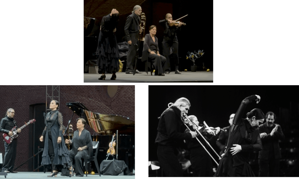 Ahora en escena Carmen Linares, Rafaela Carrasco y Pablo Suárez, (de luto riguroso) recrean aquel tiempo:
