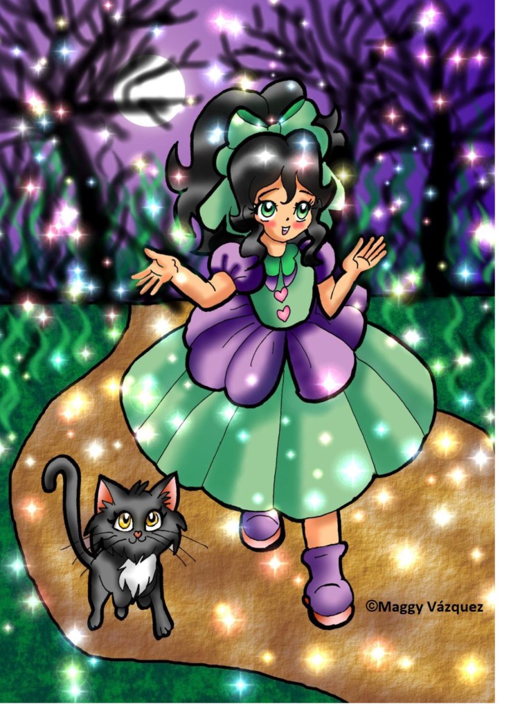 En el bosque de la vida, donde la magia y el sueño junto con la fantasía se entrelazan, donde la inocencia de los niños nos llega a hacer sentir que tocamos a las estrellas. Ahí, ahí precisamente caminaba nuestra pequeña Paula explorando mundos diferentes, nada temerosa junto a su gatita llamada luna. Caminaba con curiosidad de niña en un bosque mágico muy especial. Mientras que andaba sobre el sendero, las luciérnagas brillantes aparecían, donde en el firmamento se podía observar a la gran luna redonda que con sus ojitos de niña ella también podía mirar.