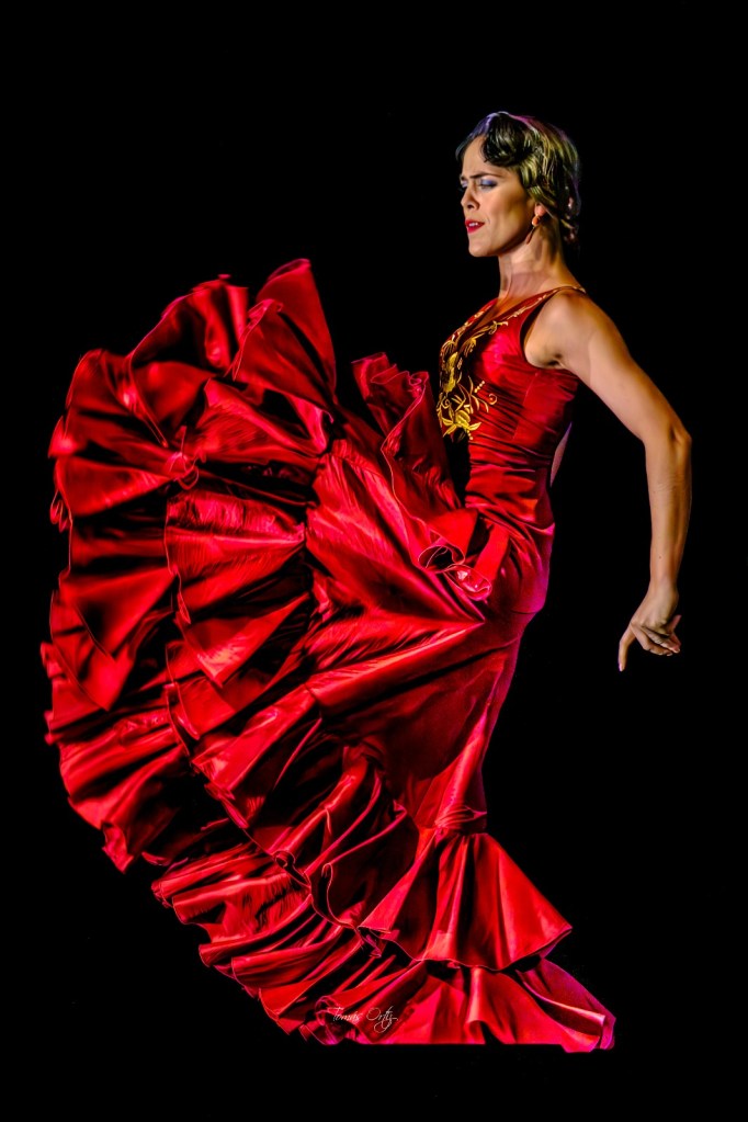 Patricia Guerrero. En una coreografía creada por ella para ella. Vestida de rojo con bordados de plata en el torso. Alta costura flamenca. El poema de Manuel Benítez Carrasco, “Fiesta en la Gloria”, dedicado a Don Ramón Montoya, recitado poniendo compás por la danza exquisita de Patricia Guerrero. Nadie danza como ella, su baile no admite comparaciones, ni mejor ni peor, es único, no creo que cree escuela. El público enmudecido ante tanta belleza.