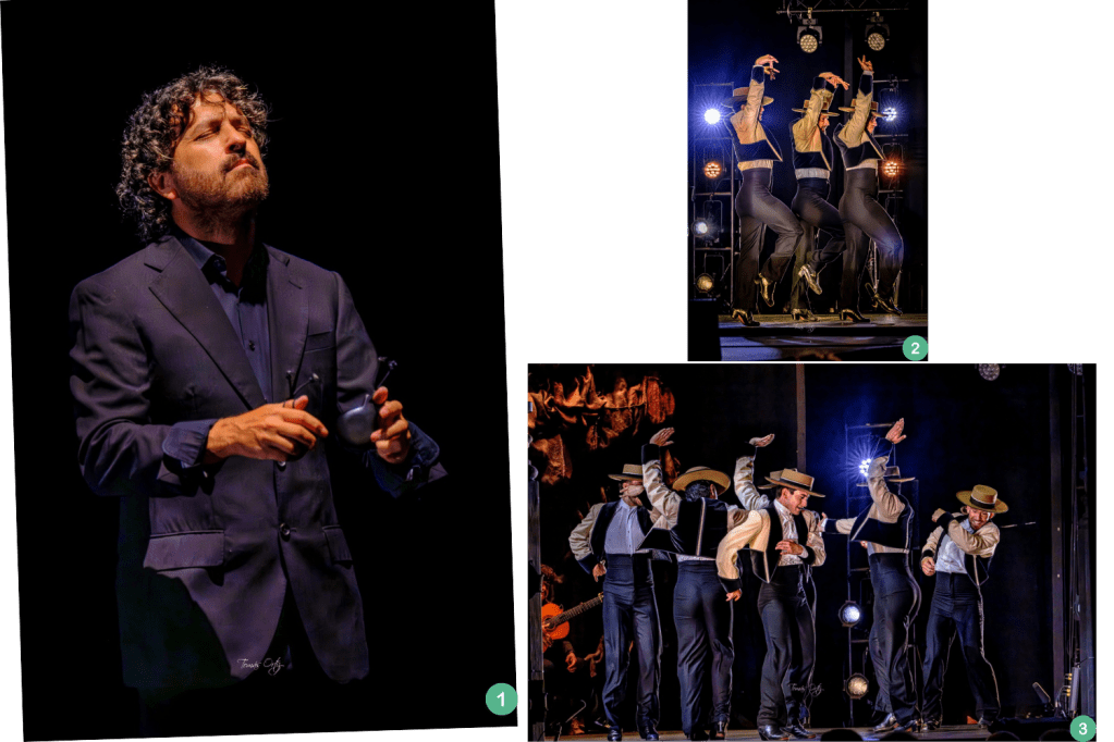 Lo más grande estaba por llegar. La “Tierra bendita” empezó con David Chupete. No es frecuente ver a un hombre haciendo un concierto solista de castañuelas, las castañuelas han sido más ben territorio femenino, pero, ¡Dios Santo! qué comienzo por castañuelas, uno se perdía mirando sus dedos y escuchando un sonido de concierto de percusión. (Eso ha existido) Baile masculino en penumbra, con resalte de perfiles, sombrero andaluz tan protagonista como los pies, por fandangos, granaína y tanguillos, en honor a los cantes y bailes de Huelva, Granada y Cádiz.