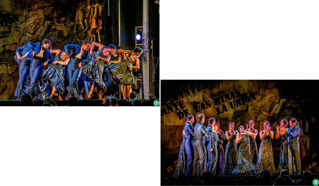 La voz de Manuel de Ginés y la guitarra de José Luis Medina emocionaron con la “Taranta del Niño”, en honor a la tierra minera y a los jornaleros andaluces de Almería desplazados al duro trabajo del pozo minero para mal ganarse un poco de sustento. La Unión siguió presente en la voz profunda de Amparo Lagares y la guitarra de Jesús Rodríguez, poniendo música y contenido a un cuadro excepcional de danza.