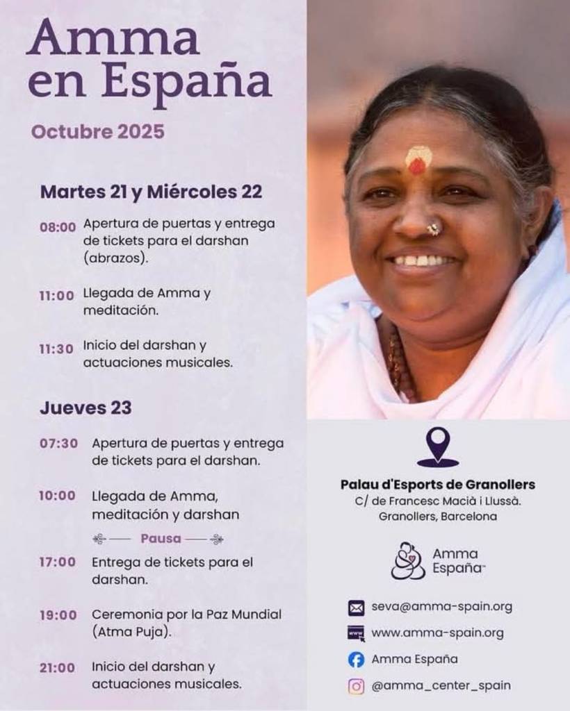 Desde el 17 de octubre al 25 de noviembre estará presente con su meditación, satsang (enseñanzas) y su único darshan de abrazo, en Austria, España, Finlandia, Francia, Alemania, Italia, Inglaterra y Países Bajos. En atención a los europeos que frecuenten nuestro medio, estas serán sus fechas y lugares.