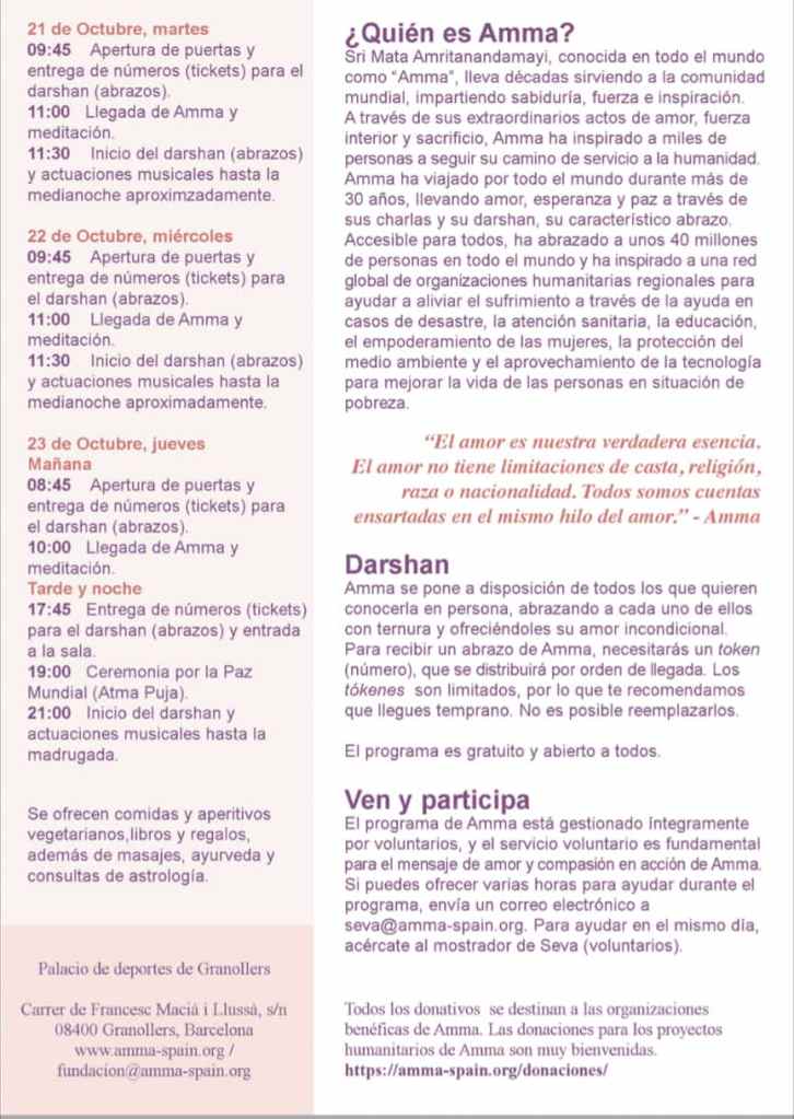 Los dos días Amma llegará a la sala a las 11 de la mañana. Guiará la meditación y dará sus enseñanzas. Hacia las 11.30 comenzará el darshan /abrazoque no parará hasta la hora de la noche en que haya pasado la última persona acreditada.