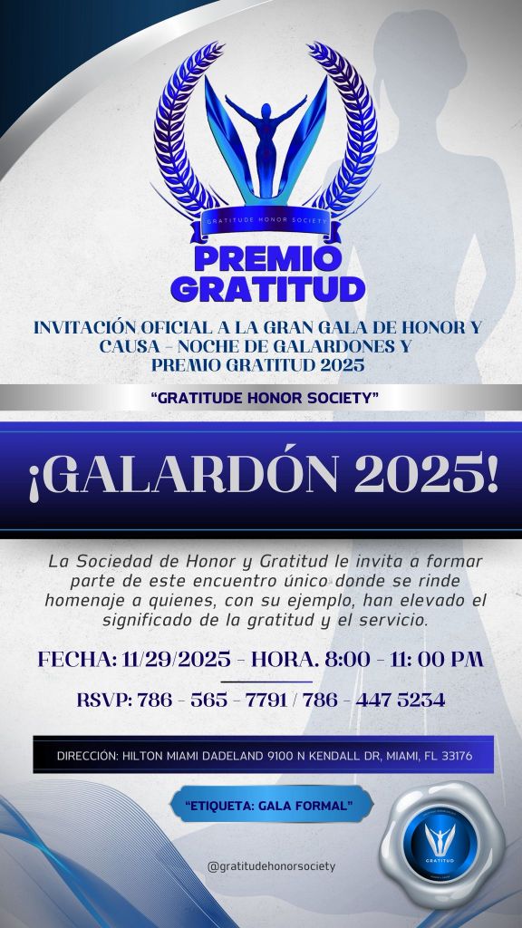 Miami, Florida – At a time when sincere recognition becomes an act of courage, the Gratitude Mission and the FVE (Foundations with Values for Success) Community announce the Honor and Cause Gala – Gratitude Awards 2025, an international event that will bring together leaders, artists, entrepreneurs, and personalities committed to service, excellence, and human legacy.