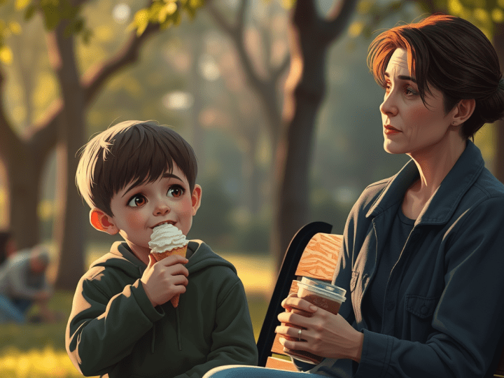 Back in the park, the mother watches her son savoring the second ice cream. He smiles. She does too, but in her gaze, a question can be sensed that perhaps will be answered with time: am I doing it right?
