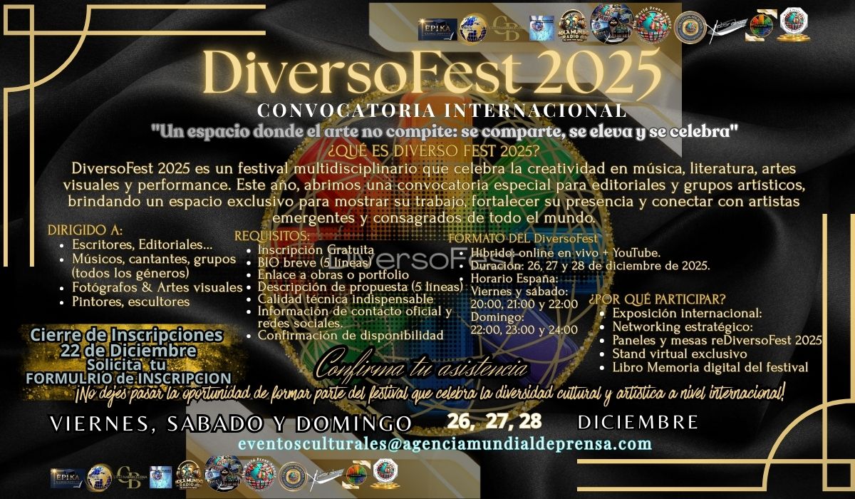 DiversoFest 2025 emerges as a space for encounter, reflection, and visibility of emerging art in its multiple expressions. Conceived as a hybrid-format cultural festival (via Zoom and YouTube Live), the event brings together music, performative poetry, literature, and visual arts under a common theme: diversity as a cultural and social driving force.