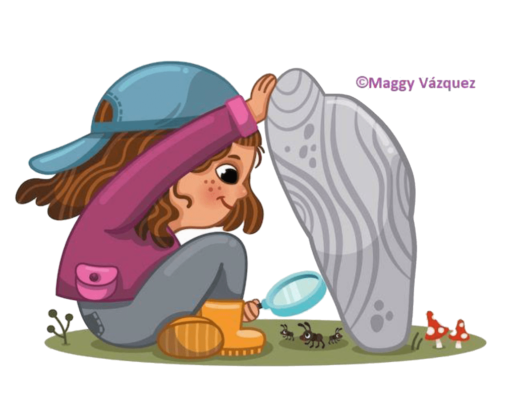 Their little amazed eyes observed with much curiosity. «Carambolas!», he replied. «Super sparks!». And they observed without touching a small family of snails of tiny size. The little girl with her lens observed carefully that great treasure! Then she pointed out 3 little shells alone, two sleeping slugs, 4 black pill bugs, and 3 gray worms. «Snails!». Through her lens she could see the wonder of life: «See, ‘Kim,’ what a marvel.»