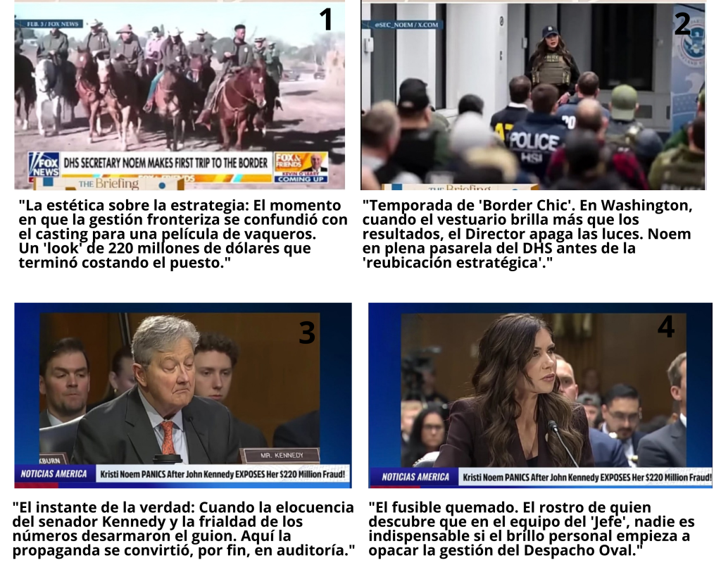 1 «Aesthetics over strategy: The moment border management was mistaken for casting for a Western. A $220 million ‘look’ that ended up costing him his job.» 2 «Border Chic season. In Washington, when the wardrobe outshines the results, the Director turns off the lights. Noem on the DHS catwalk before the ‘strategic relocation’.» 3 «The moment of truth: When Senator Kennedy’s eloquence and the coldness of the numbers dismantled the script. Here, propaganda finally became an audit.» 4 «The blown fuse. The face of someone who discovers that in the ‘Boss’ team, no one is indispensable if personal brilliance begins to overshadow the management of the Oval Office.»