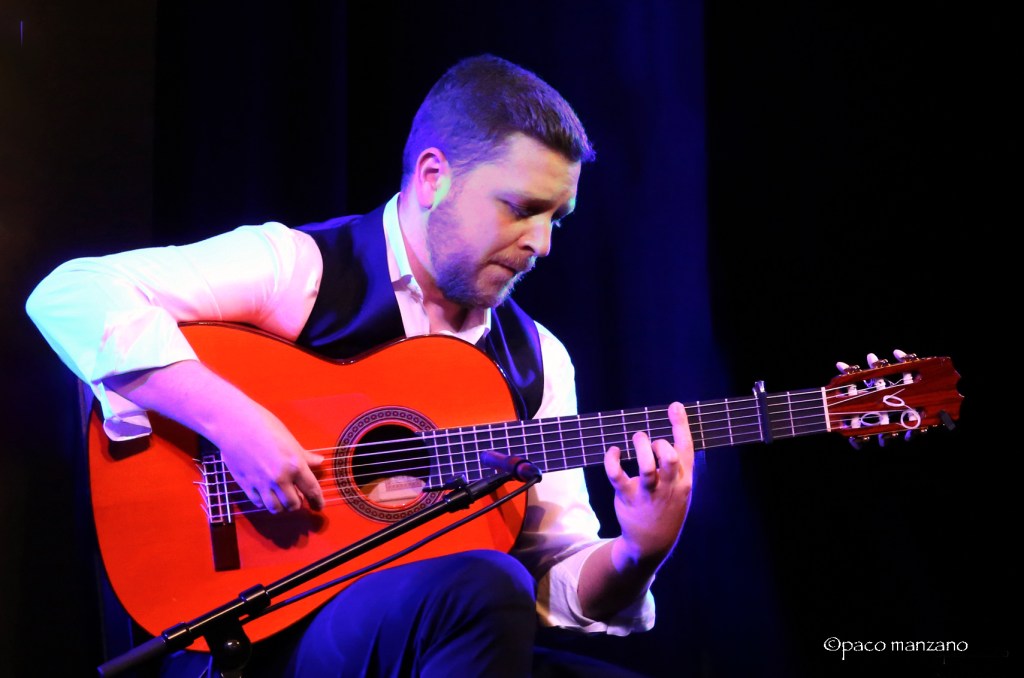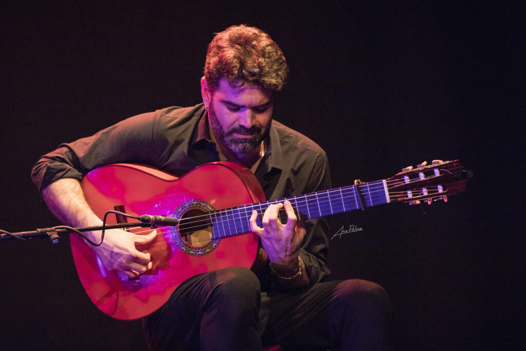 El 23 de abril, desde la Sala Negra nos trasladamos a la Sala Verde para asistir a la primera gala del festival, protagonizada por el guitarrista malagueño Francisco Vinuesa, que fue discípulo de Pedro Blanco y de Gerardo Núñez. Vinuesa es uno de los guitarristas y compositores más respetados de la escena flamenca contemporánea, consolidado en los últimos años como creador de bandas sonoras para espectáculos de gran formato. Es Premio Max del Público (2020) como parte del equipo del espectáculo ¡VIVA! de Manuel Liñán; y Premio a la Mejor Composición Original en el Festival de Jerez 2024 por el espectáculo Alter Ego, de Alfonso Losa y Patricia Guerrero.