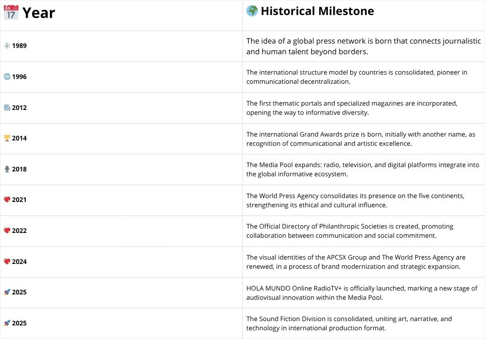 | 💖 2024 | Se renuevan las identidades visuales del APCSX Group y de La Agencia Mundial de Prensa, en un proceso de modernización de marca y expansión estratégica. |